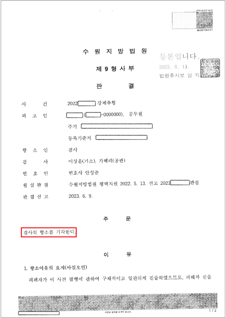[1심 무죄 그러나 검사 항소 그리고 검사 항소 기각]
