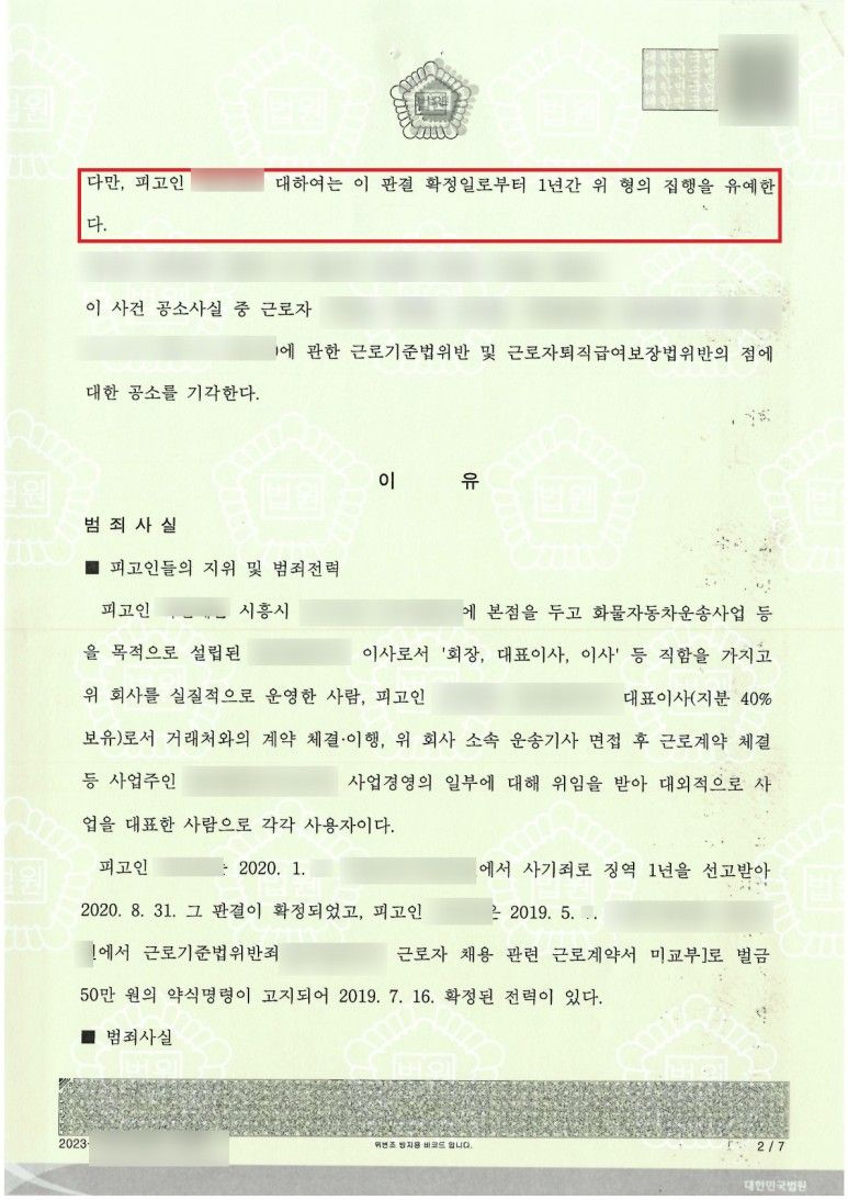 결국 재판부는 의뢰인에게 "피고인을 징역 6월에 처한다. 다만 이 판결 확정일로부터 1년간 위 형의 집행을 유예한다"는 집행유예 판결을 선고하면서, 범죄사실 중 합의된 근로자에 대한 부분은 공소기각 판결을 선고하였습니다.