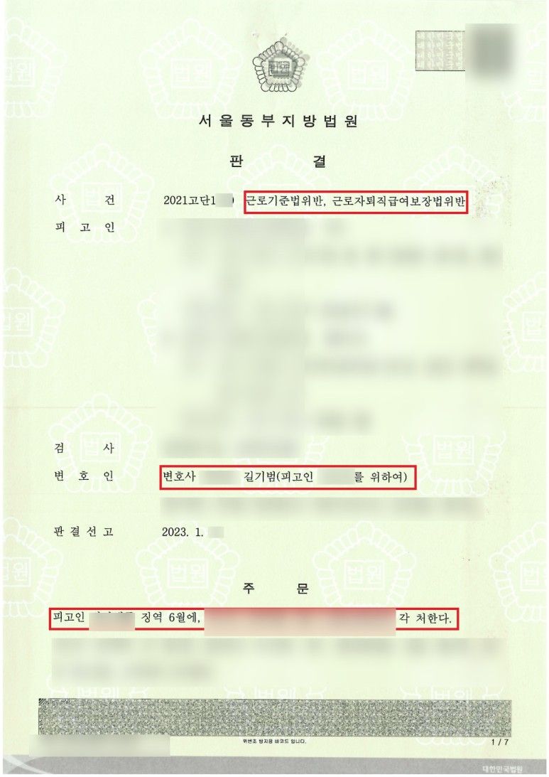 안녕하세요. 길기범 변호사입니다. 의뢰인이 근로기준법위반, 근로자퇴직급여보장법위반으로 기소되었으나 집행유예가 선고된 사례를 소개하겠습니다.