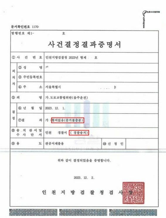 경찰에서 기소 의견으로 송치한 음주운전 재범 사건 불기소처분(무혐의) 도출!!
