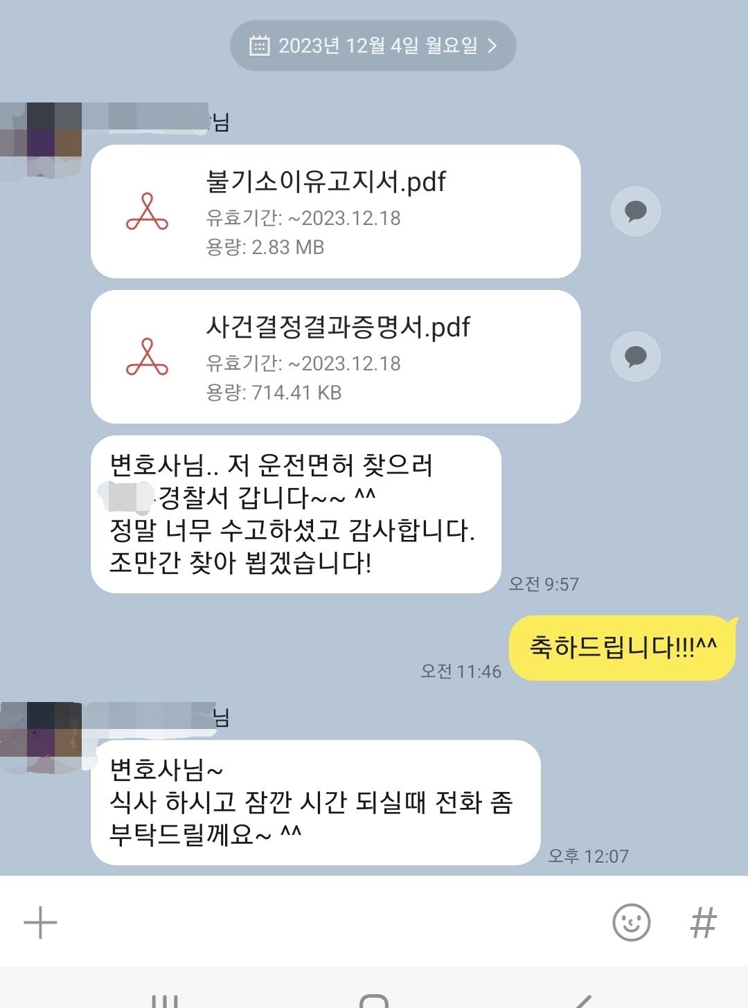 의뢰인이 운전할 당시를 기준으로 혈중알코올농도가 처벌기준치(0.03%)를 초과하지 않는다는 점에 관한 증거를 수집하고 이와 관련된 유사사건 판례를 비교 분석한 변호인 법리의견서를 작성하여 총 2회 제출