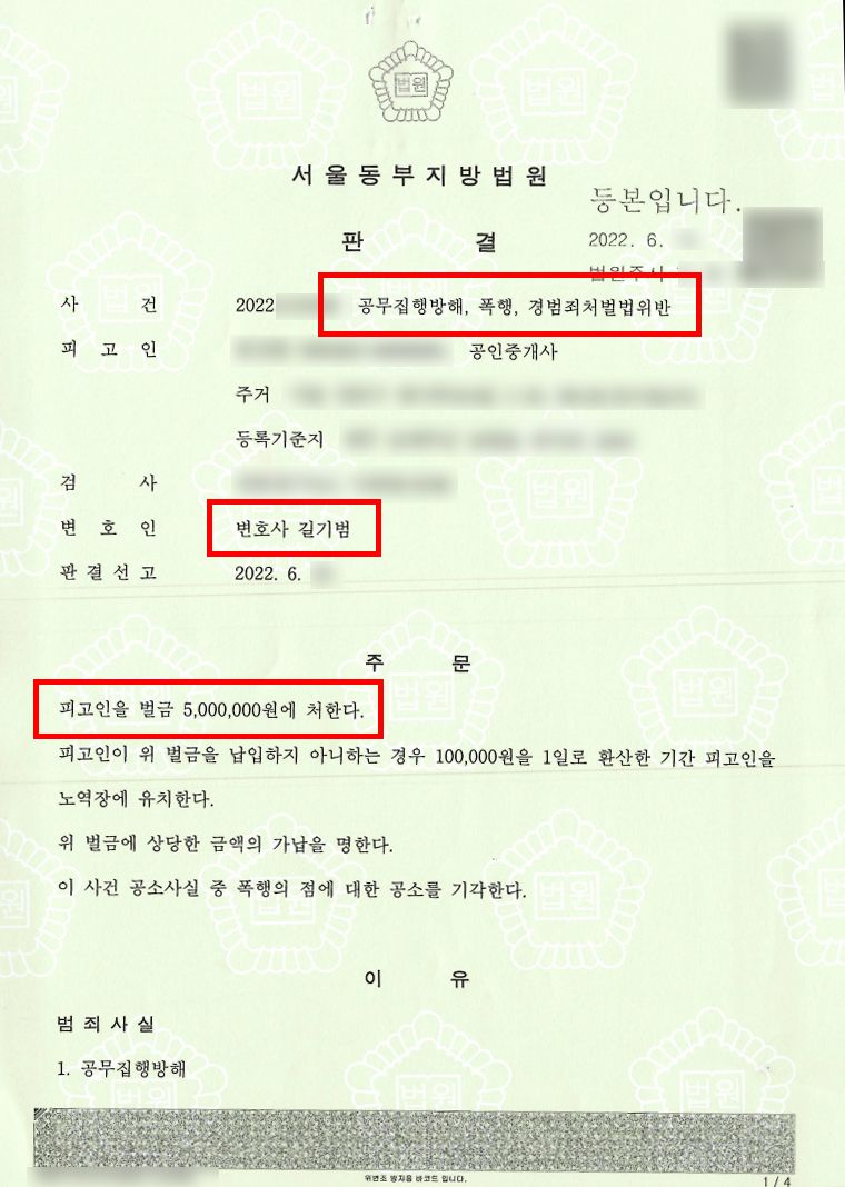 피고인은 위와 같은 행동을 하였다는 이유로 공무집행방해죄, 폭행죄, 경범죄처벌법위반죄로 기소되었는데, 피고인의 직업은 공인중개사로 만약 금고 이상의 실형이나 집행유예가 선고될 경우 공인중개사 등록이 취소되고, 소속공인중개사나 중개보조원으로 일할 수 없게 되어 생계가 막막한 상황이었습니다.