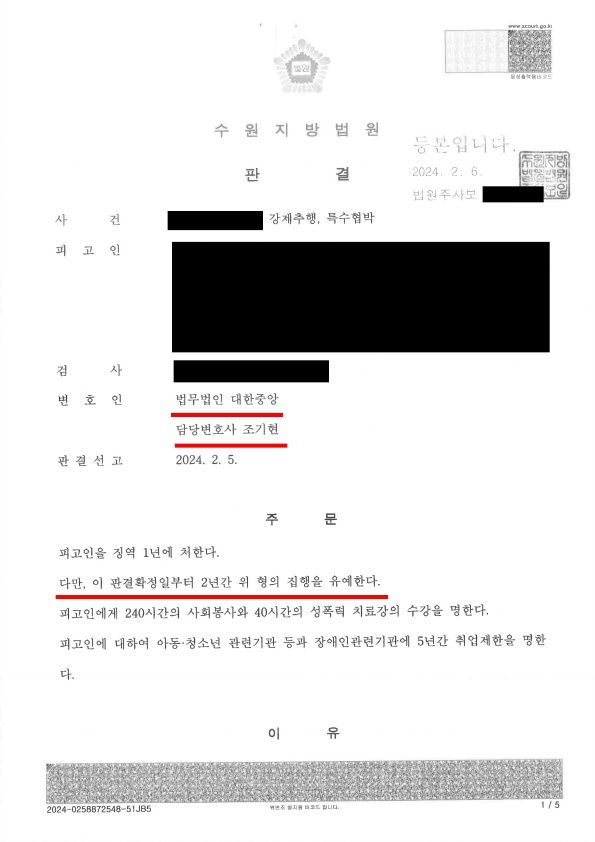 재판부는 추행의 정도가 가볍지 않고 피해자가 엄벌을 탄원하는 상황이라는 것을 인정하면서도 조기현 변호사가 소명한 사정을 참작하였다며 집행유예를 선고했습니다.