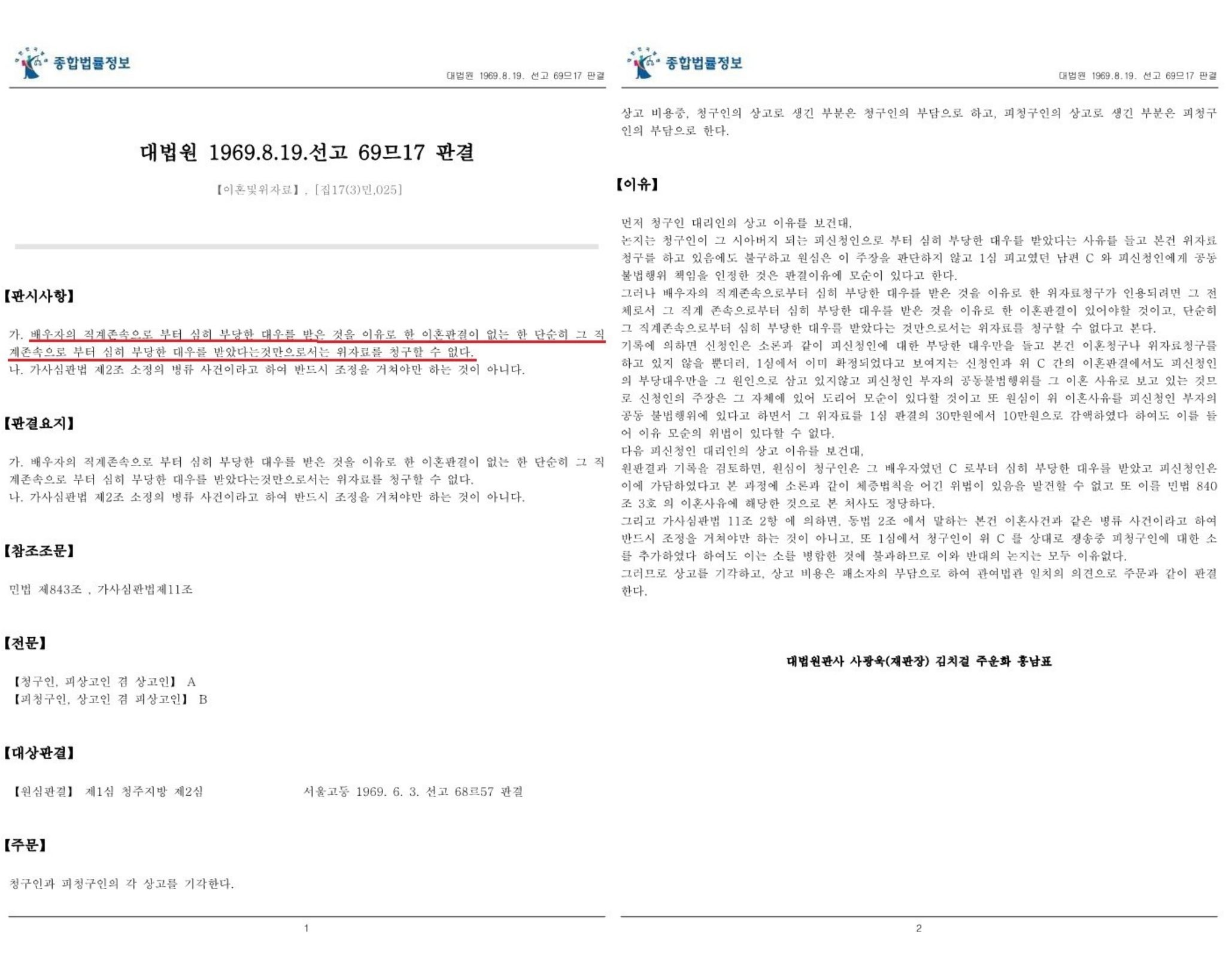 [배우자의 직계존속으로부터 부당한 대우를 받은 것만으로는 이혼판결이 없는 한 위자료 청구 사유가 되지 않습니다. : 대법원 1969. 8. 19. 선고 69므17 판결]