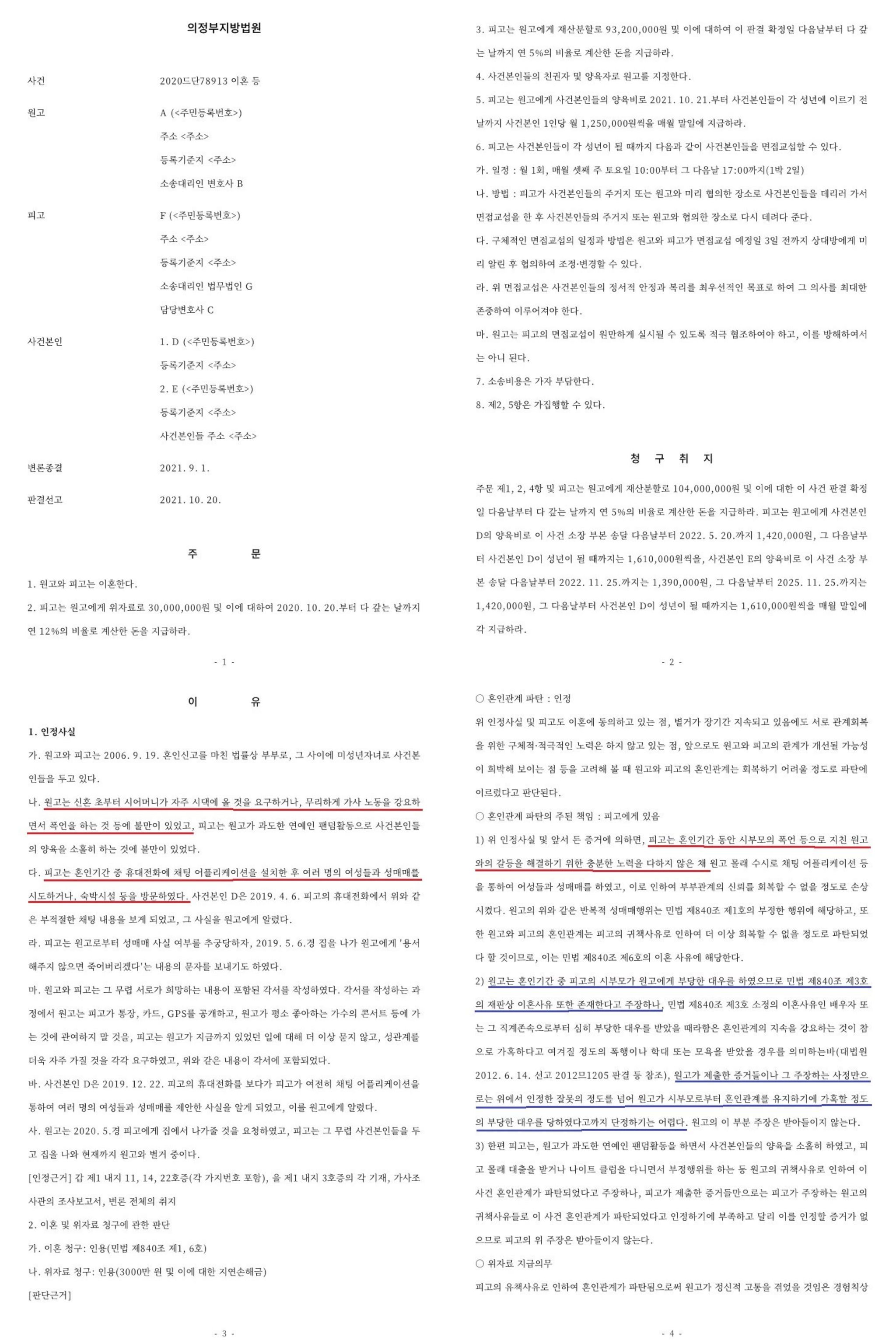 [남편인 피고가 시어머니로부터 폭언 등으로 지친 원고와의 갈등을 해결하지 않았던 것과 성매매한 점을 들어 피고에게 혼인파탄의 책임을 인정한 사건 : 의정부지방법원 2021. 10. 20. 선고 2020드단78913 판결]