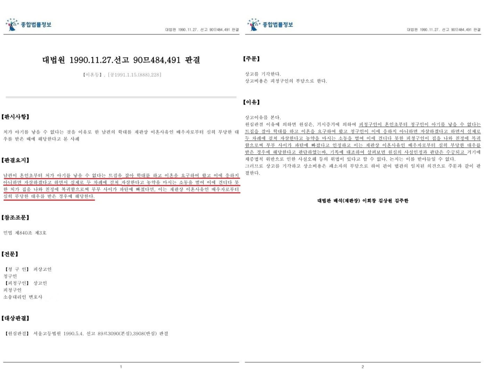 [처가 아기를 낳을 수 없다는 것을 이유로 한 남편의 학대를 재판상 이혼사유인 배우자로부터 심히 부당한 대우를 받은 때에 해당한다고 보아 이혼청구를 인용한 사건 : 대법원 1990. 11. 27. 선고 90므484,491 판결]