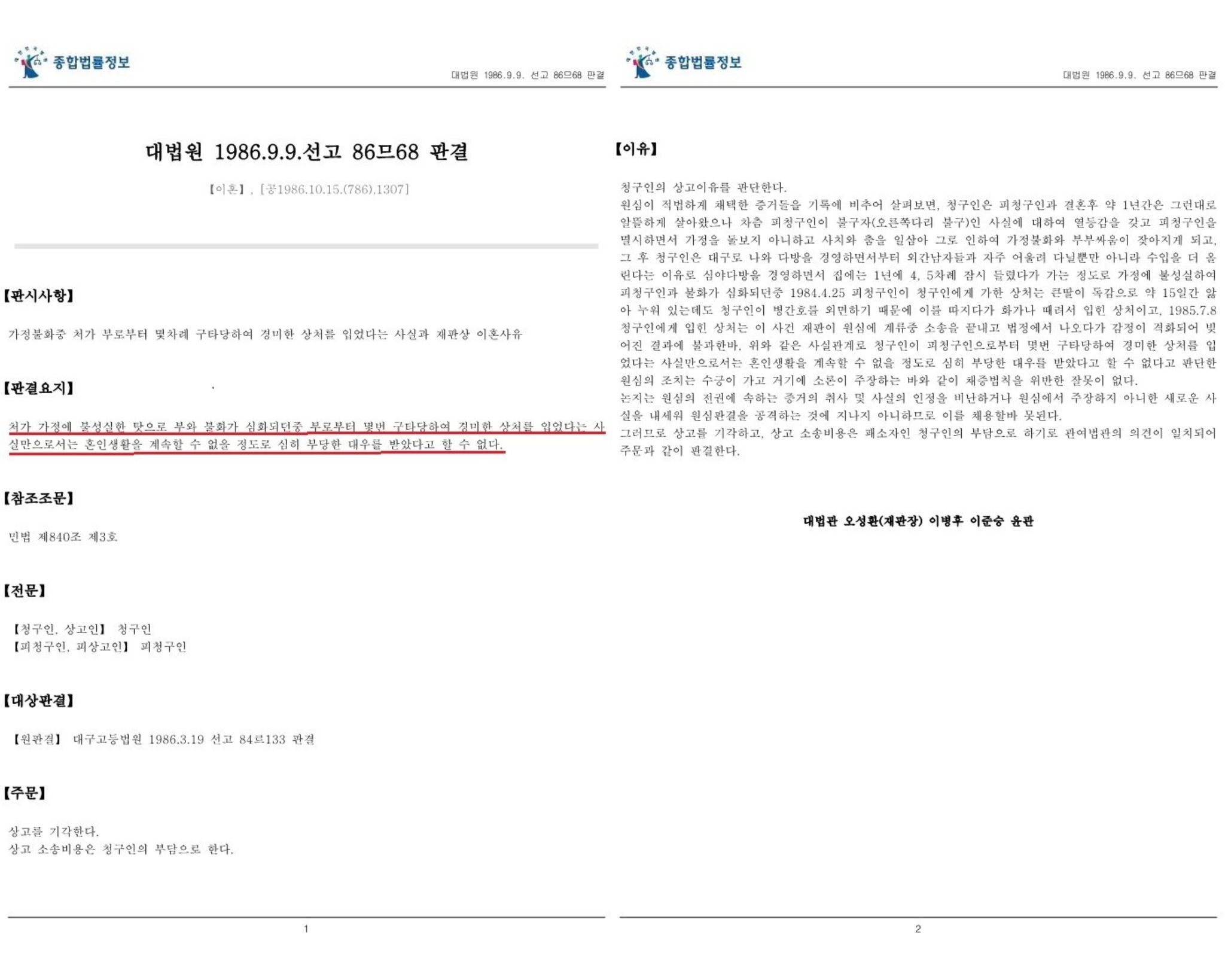 [가정불화중 처가 부로부터 몇차례 구타당하여 경미한 상처를 입었다는 사실로 배우자로부터 심히 부당한 대우를 받았다고 할 수 없다고 보아 이혼청구를 기각한 사건 : 대법원 1986. 9. 9. 선고 86므68 판결]