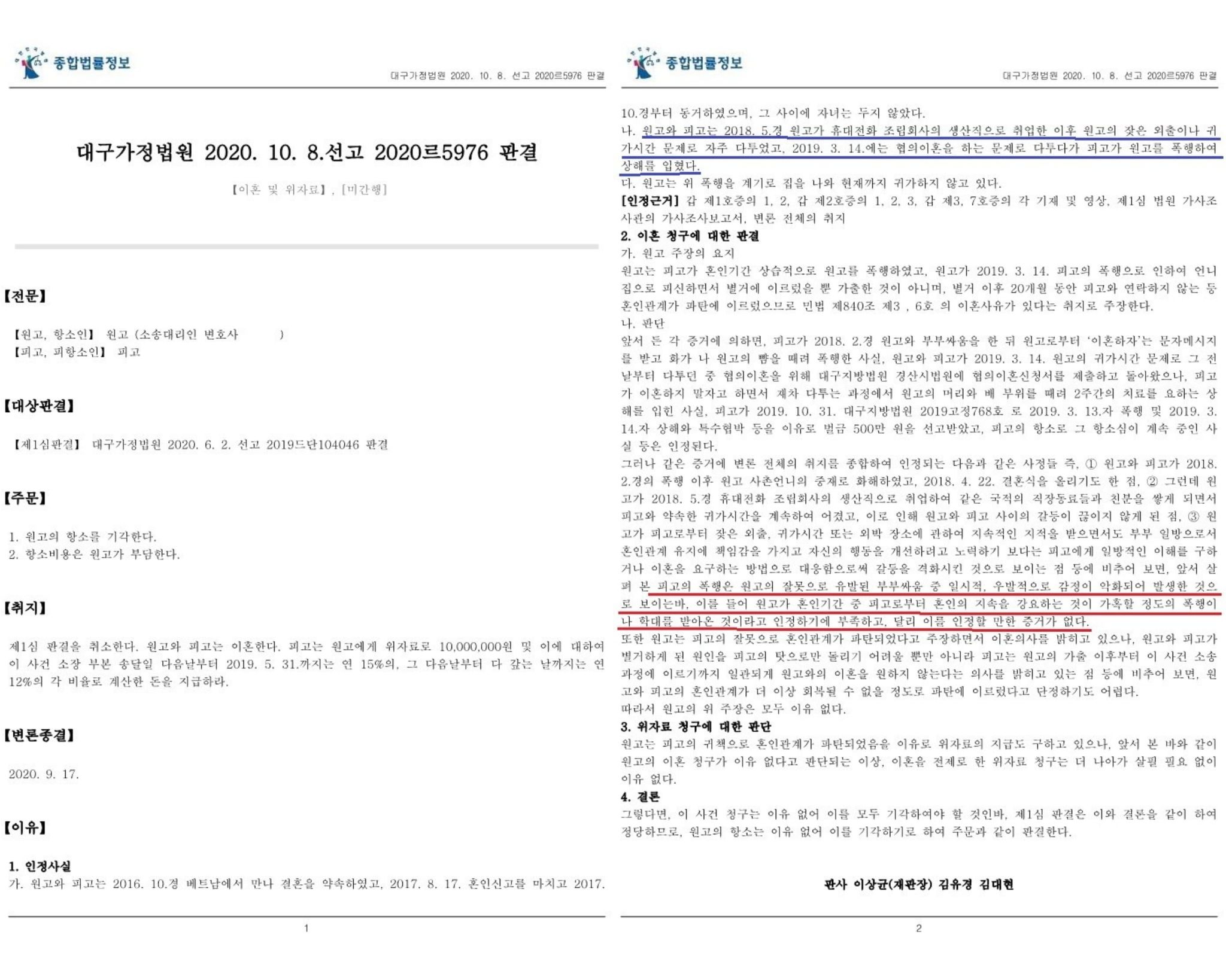 [피고가 원고를 몇 차례 폭행하여 상해를 입힌 것과 관련하여 재판상 이혼원인으로 삼을 부당한 대우를 받으로 것으로 볼 수 없다고 판단하여 이혼청구를 기각한 사건 : 대구가정법원 2020. 10. 8. 선고 2020르5976 판결