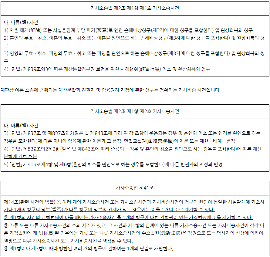 가사소송법은 “여러 개의 가사소송사건 또는 가사소송사건과 가사비송사건의 청구의 원인이 동일한 사실관계에 기초하거나 1개의 청구의 당부(當否)가 다른 청구의 당부의 전제가 되는 경우에는 이를 1개의 소로 제기할 수 있다.”라고 규정하는 등 관련 사건의 병합을 규정하고 있으므로 가사소송사건인 재판상 이혼 소송에서 가사비송사건인 재산분할 등의 사건을 병합할 수 있는 것입니다. 그러나 병합하여 제기하지 아니하고 재판상 이혼 소송, 이혼을 원인(파탄)으로 한 위자료, 재산분할, 친권자 및 양육권자 지정, 면접교섭권 등을 별도로 제기할 경우에는 관련 규정에 따라 가사소송사건과 가사비송사건 관련 규정에 따라 별개의 사건으로 진행될 것입니다.