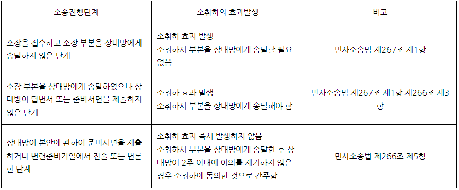 먼저 소송절차를 진행하다가 원고의 사정에 따라 소를 취하할 수 있습니다. 원고가 소송을 취하하면 소송을 제기하지 않은 효과가 발생하게 됩니다(민사소송법 제267조 제1항). 그런데 소송의 취하도 소송이 진행되는 단계에 따라 취하의 효과가 바로 발생하지 않는 경우가 있습니다.