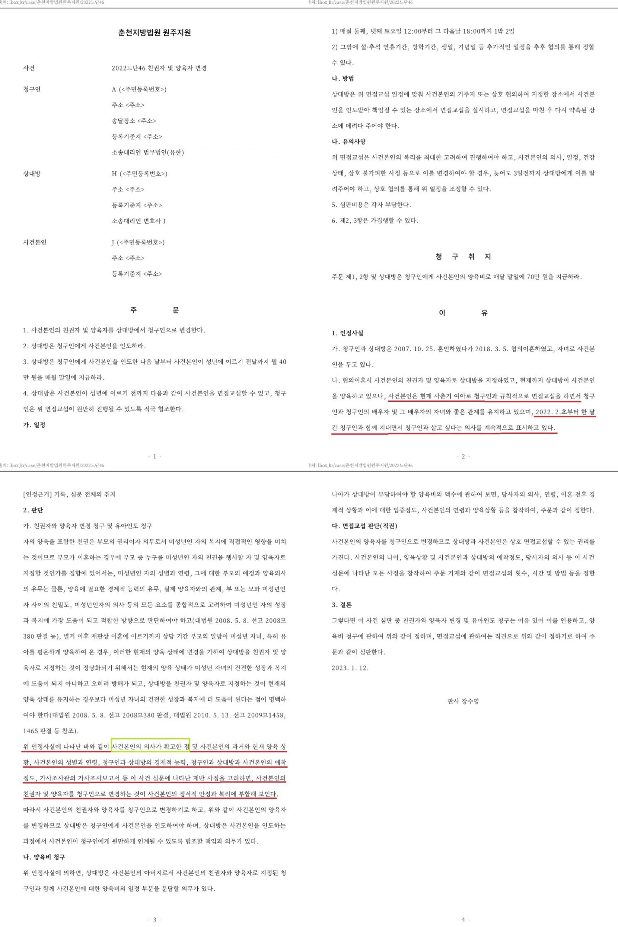 => 즉 당사자 사이의 원만한 합의로 지정된 것을 얼마 지나지 않아 변경하겠다고 하는 것은 사정변경이 없는 한 기각된다는 것인데 이는 일반적인 법원의 입장입니다. 이러한 점을 보더라도 협의이혼이든 재판상이혼이든 변호사의 조력을 받아 신중히 결정해야 한다는 것을 알 수 있습니다.