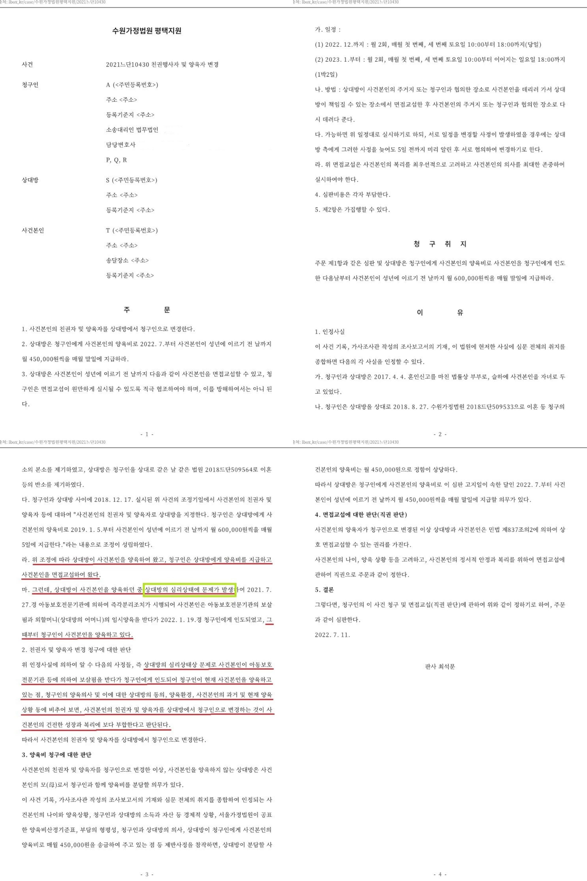 => 다만 이 경우는 상대방이 변경에 동의가 있다는 점에서 결론이 이미 정해진 사안이 아닌가 싶은데 보통 제 포스팅을 보고 변경청구를 고민하는 분들은 상대방의 동의가 없을 것입니다. 다만 이 사안의 경우 상대방이 변경에 동의하지 않았더라도 인용되었을 것이라 판단됩니다.