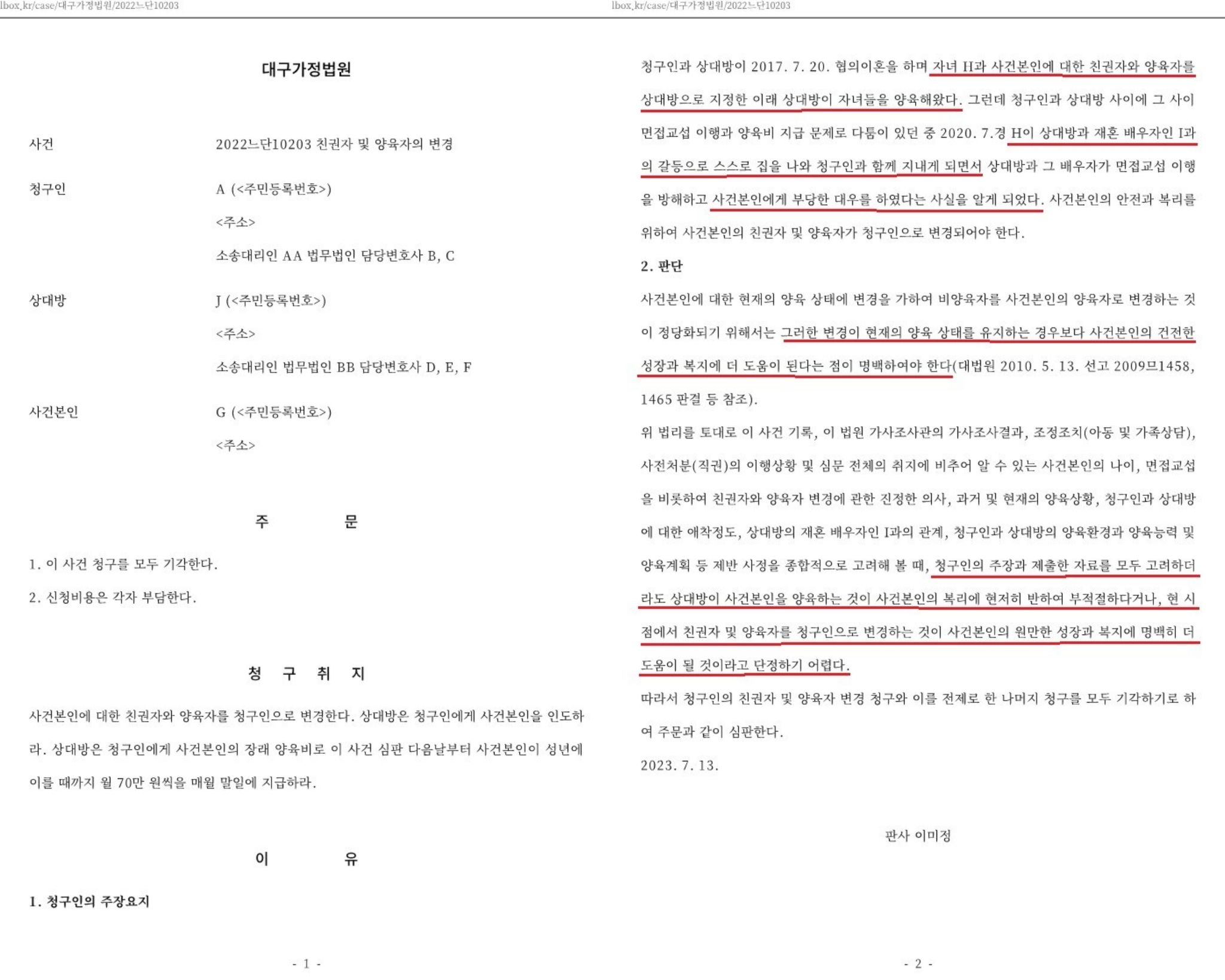 - 사건본인이 아닌 다른 자녀가 상대방의 재혼 배우자와의 갈등으로 집을 나와 청구인과 지냈으나 기각된 사례 : 대구가정법원 2023. 7. 13. 결정 2022느단10203 심판