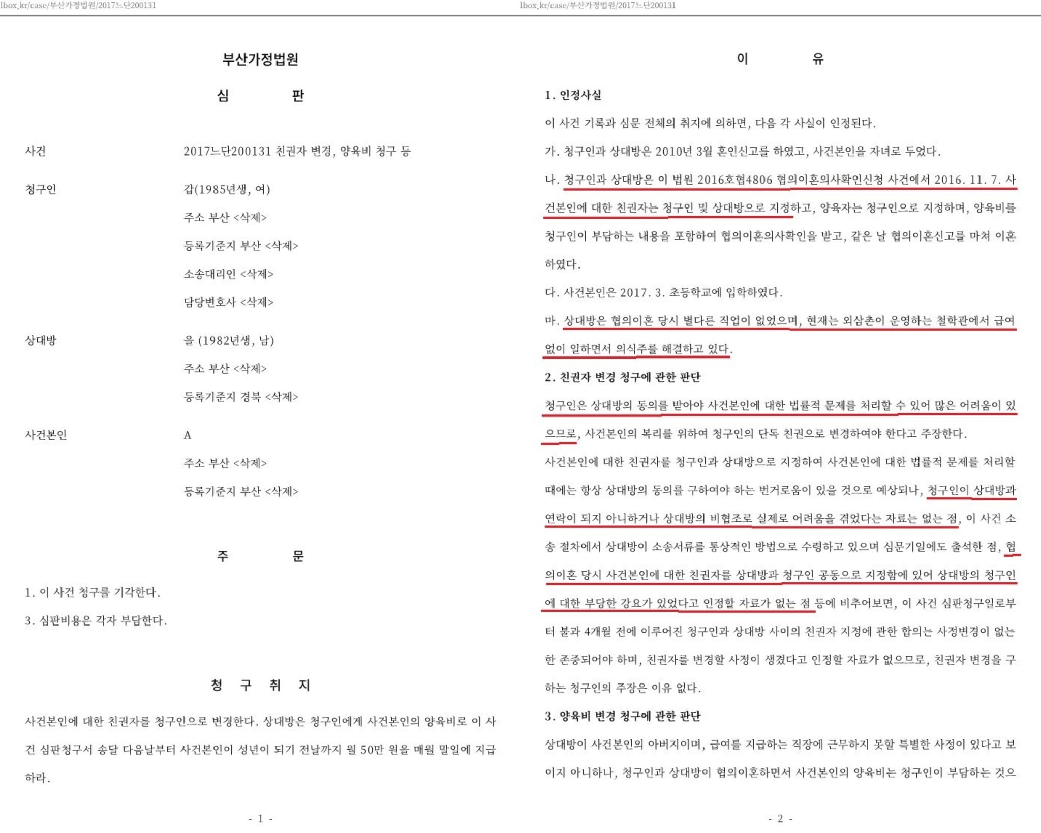 [친권자 및 양육권자 변경 신청이 인용된 사례]