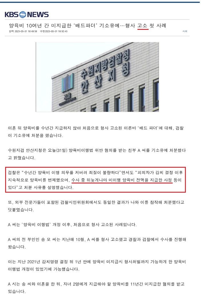 양육비 채무자의 전면허 정지처분 요청, 출국금지, 명단 공개에도 꿈쩍도 하지 않을 경우 형사고소도 적극 고려할 필요가 있다고 할 것입니다. 위 KBS 기사와 같이 양육비 미지급에 대하여 형사고소를 하자 바로 연체한 양육비를 지급한 사례도 있습니다.