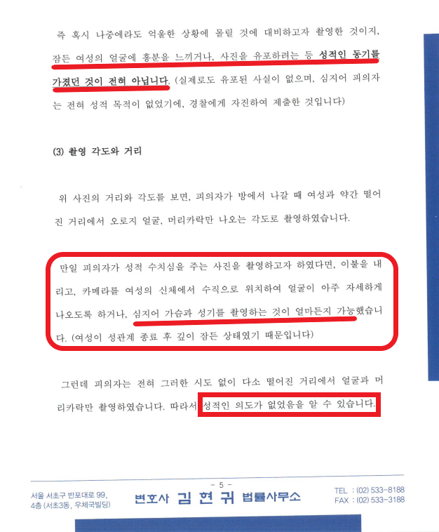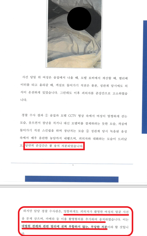 그런데 변호인의견서를 읽어본 후 도저히 준강간으로는 송치할 수 없다고 생각되자, 엉뚱하게도 저희 측에서 제출한 여성 B의 사진 (A가 B의 목까지 이불을 덮어준 후 얼굴이 나오게 찍은 것)을 문제삼아 카메라이용촬영죄로 송치해버렸습니다. 그 이유는 아래 2가지였습니다.