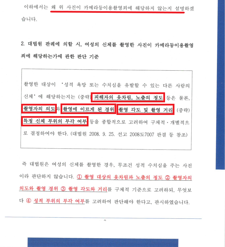 1) 대법원 판례는 카촬죄의 객체가 되는지 판단할 때 ① 촬영 대상의 옷차림과 노출의 정도 ② 촬영자의 의도와 촬영 경위 ③ 촬영 각도와 거리를 구체적 기준으로 고려하되, 무엇보다 ④ 성적 부위의 부각 여부를 고려함.