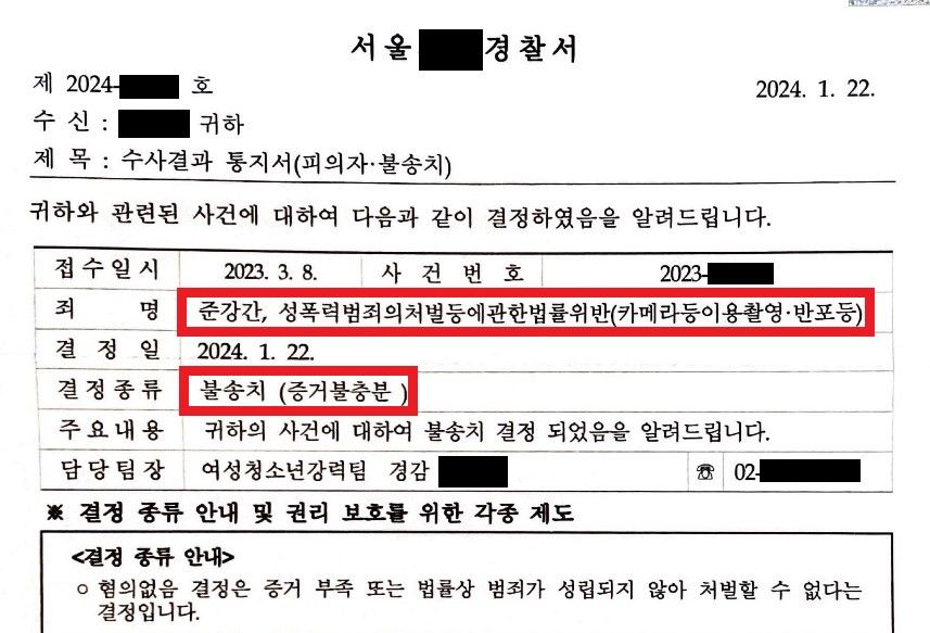 나. 담당 여성 수사관의 독단적인 판단으로 인하여 카메라이용촬영죄는 송치됨.