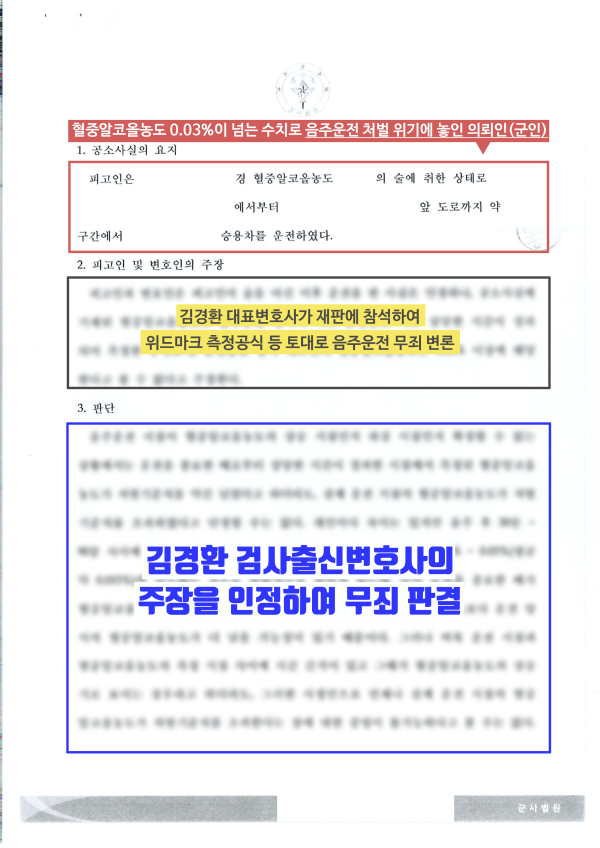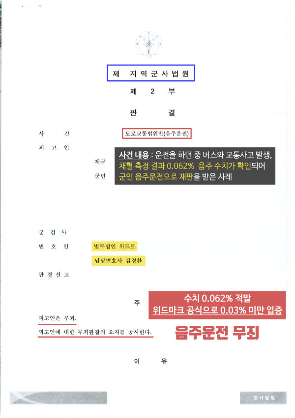 그 결과, 군사법원 재판부는 김경환 형사전문변호사의 주장과 법적인 근거 설명을 모두 인정하여 무죄를 선고했습니다. 형사 절차에 있어서 음주운전 무죄 판결이 나면서 효력이 정지되었던 면허증도 회복이 되었고, 의뢰인이 가장 염려했던 군인 징계(정지~감봉)도 면할 수 있었습니다.