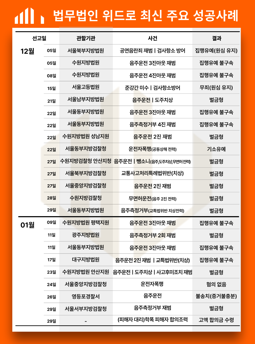 김경환 검사출신변호사는 다년간 공무원 및 군인 음주운전 사건들을 많이 처리한 노하우를 바탕으로 자세한 상담부터 직접 진행했습니다. 술을 언제 마셨는지, 운전을 한 시점, 측정 결과 등 여러 요건을 파악한 위드로 대표변호사는 위드마크 공식을 적용하기로 하고, 이를 바탕으로 수사단계부터 조사 대비 등 철저하게 조력해나갔습니다.