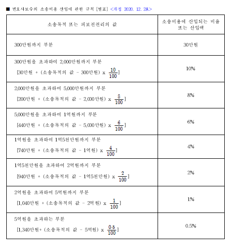 소송비용은 소가 (소송금액)에 비례해서 받을 수 있다. 하지만 실제 지출되는 수임료와 법에서 정해놓은 소송비용 한도액 중 적은 돈으로 계산된다. 예컨대 수임료가 착수금 성공보수 합해서 1,500만 원이라도, 소가 (소송금액) 1억 8천만 원일 때의 소송비용 한도액은 1,000만 원이다. 이때는 100% 승소해도 상대방에게 1,000만 원을 받는다. 500만 원은 본인 부담이다.