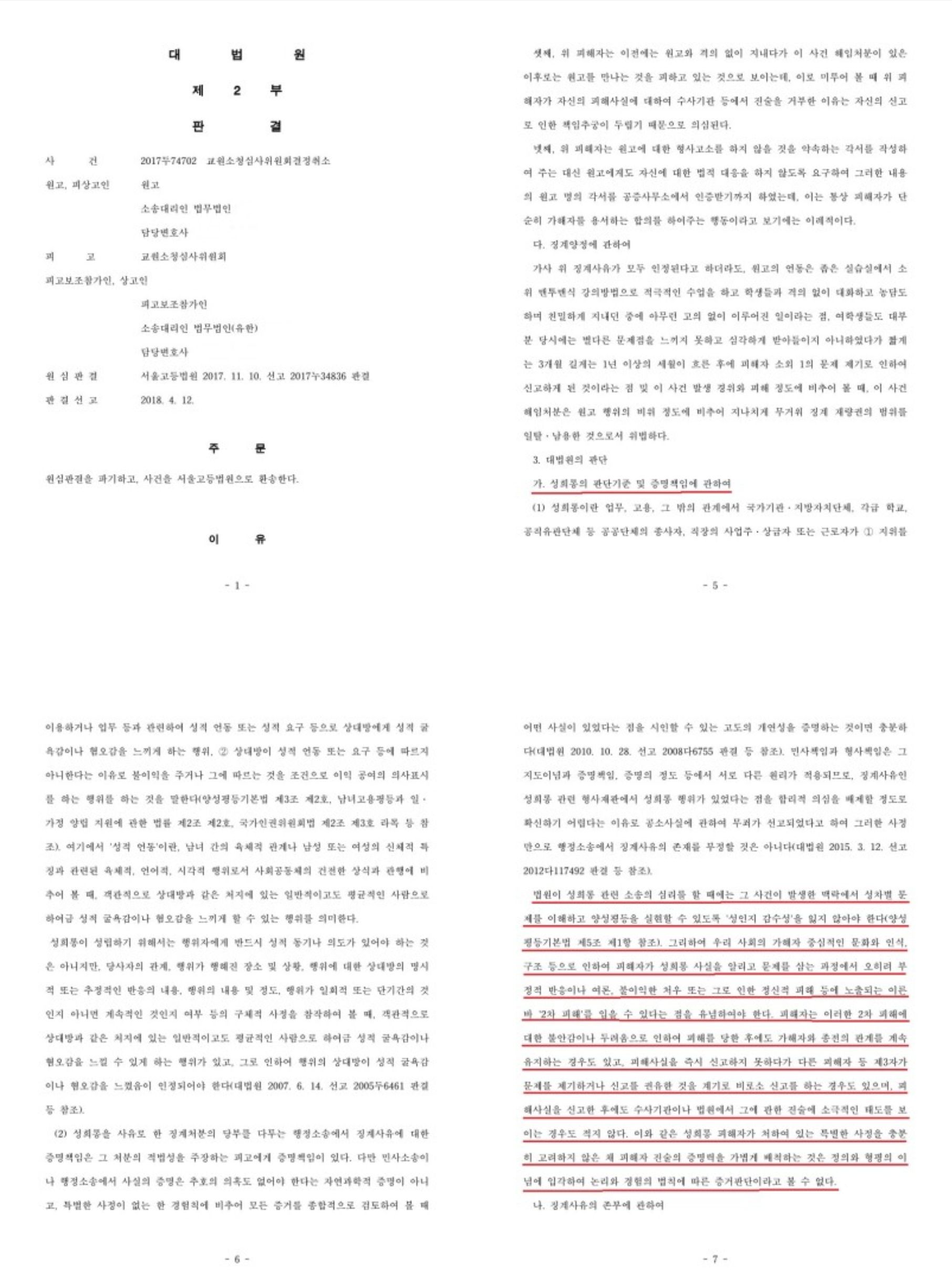 [행정소송사건에서 성인지 감수성과 성희롱 문제 : 대법원 2018. 4. 12. 선고 2017두74702 판결]