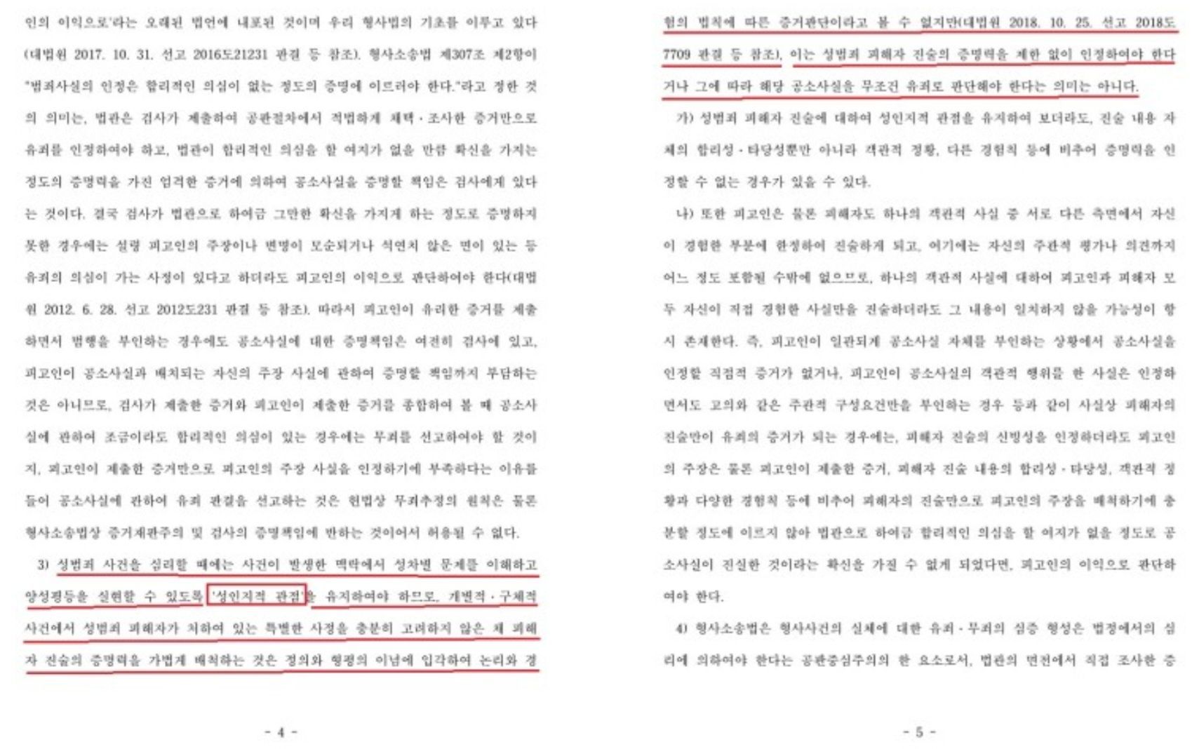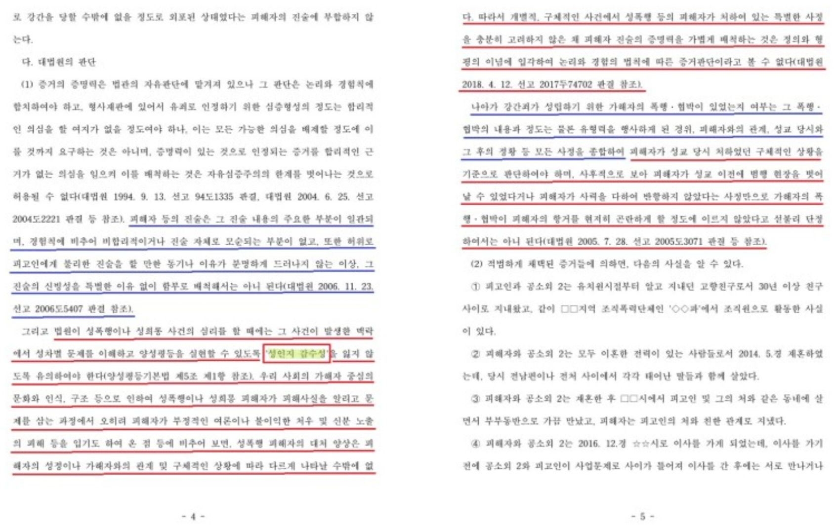 “원심이 피해자 진술의 신빙성을 배척하는 이유로 들고 있는 사정들은, 피해자가 처한 구체적인 상황이나 피고인과 피해자의 관계 등에 비추어 피해자의 진술과 반드시 배치된다거나 양립이 불가능한 것이라고 보기 어렵다. 그럼에도 원심이 그러한 사정들을 근거로 피해자 진술의 신빙성을 배척한 것은 성폭행 피해자가 처하여 있는 특별한 사정을 충분히 고려하지 않음으로써 성폭행 사건의 심리를 할 때 요구되는 ‘성인지 감수성’을 결여한 것이라는 의심이 든다.”고 판단하였으며,