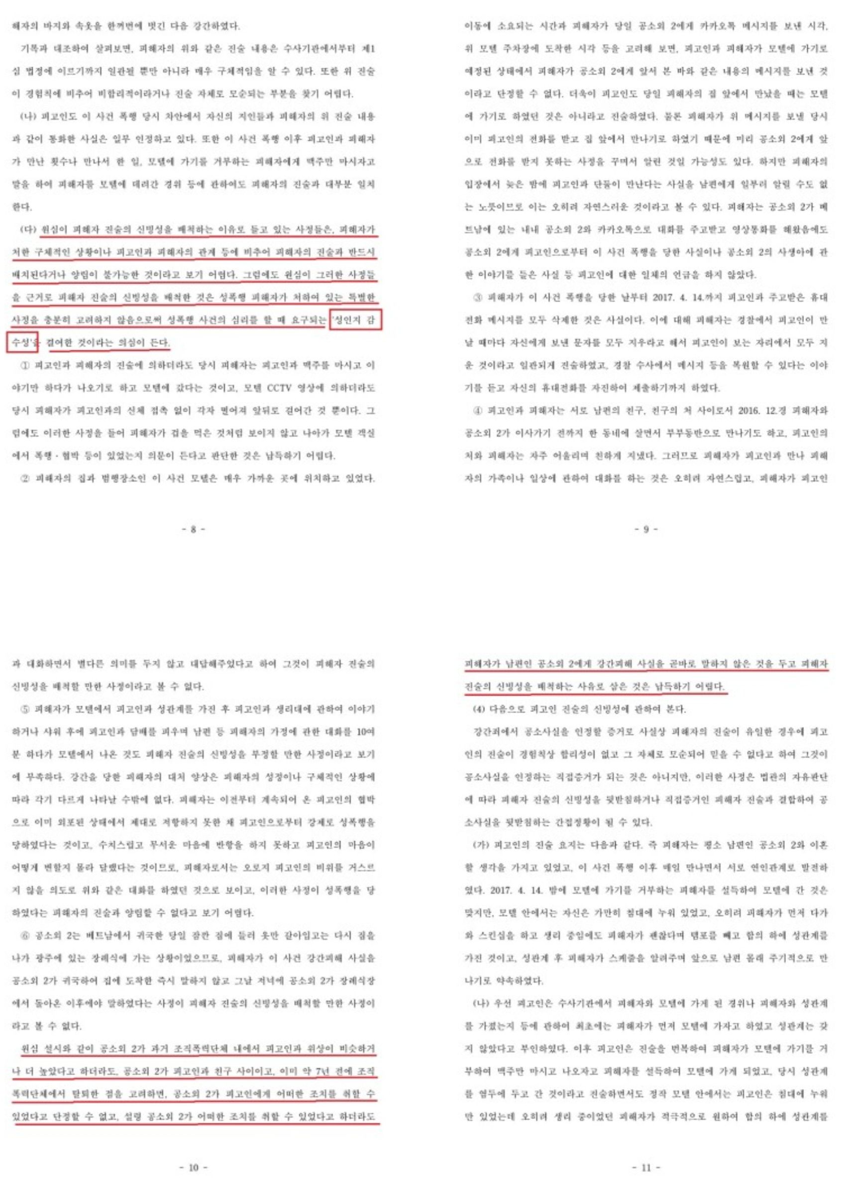 성인지 감수성 관련한 대법원 판결들이 나온 이후로 지방법원, 고등법원 판사님들 사이에서는 성범죄는 무죄판결을 내려도 어차피 대법원에서 깨진다는 인식이 퍼졌고 피해자님의 진술은 '허위로 피고인에게 불리한 진술을 할 만한 동기나 이유가 분명(있는 것으로 부족하고 분명까지 해야 함. 괄호 안은 그냥 제 설명임.)하게 드러나지 않는 이상, 그 진술의 신빙성을 특별한 이유 없이 함부로 배척해서는 아니 된다'는 교지를 따라 좀 이상해도 그냥 유죄로 판단하는 복지부동식 판단이 만연해졌다고 개인적으로 생각하고 있습니다. 동기나 이유없이 지하철역에서 칼로 찔러 죽이는 사람도 있는데 이 논리라면 동기와 이유가 분명하지 않은 것을 넘어 없기 때문에 살인죄가 아니라는 것입니다. 강간 무고를 당해도 수사권도 없는, 고소를 당해 상당수 구속되어 있는 사람이 그 구체적인 무고 동기를 밝히지 않으면 처벌 받는다는 해괴한 논리가 아닐까 싶습니다. 무엇보다 돈을 목적으로 성범죄 무고를 하는 경우도 절대 먼저 합의금을 제안하면 안 되고 "돈이 얼마라도 제가 받은 피해는 회복될 수 없다, 자살을 시도하여 정신과 진료까지 받았다"라고 정신과 한 번 찾아가고 처방받고 받은 약은 안 먹는 식(약을 받은 것이 중요하지 그것을 실제 먹었는지 알 수 있는 방법은 없음)으로 대응하여 1심에서 구속시키고 항소심에서 마지못해 받아주는 척 더 큰 금액을 받는 방식은 여성시대를 조금만 보더라도 알 수 있는 일반적인 것인데 이런 나이브한 대응에도 속아넘어갈 논리에 지나지 않는 것입니다.