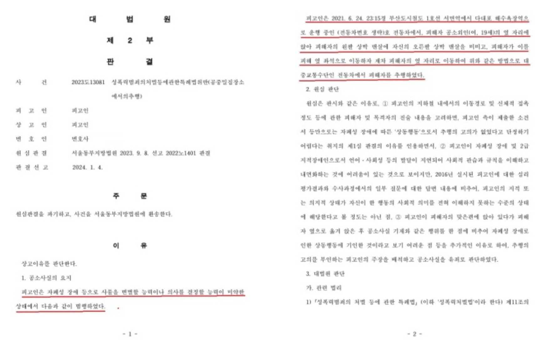 성인지 감수성에 관한 판단과 관련하여 대법원 2018. 10. 25. 선고 2018도7709 판결에서는 피해자를 기준으로 판단하였으나 대법원 2024. 1. 4. 선고 2023도13081 판결에서는 피고인이 자폐성 장애 겸 지적장애인이었기는 하나 피고인의 입장에서 판단한 것입니다.