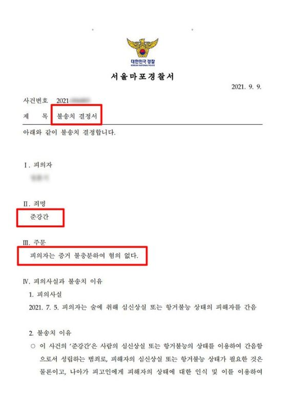 3. 혐의를 입증할 증거 부족으로 준강간 불송치 결정