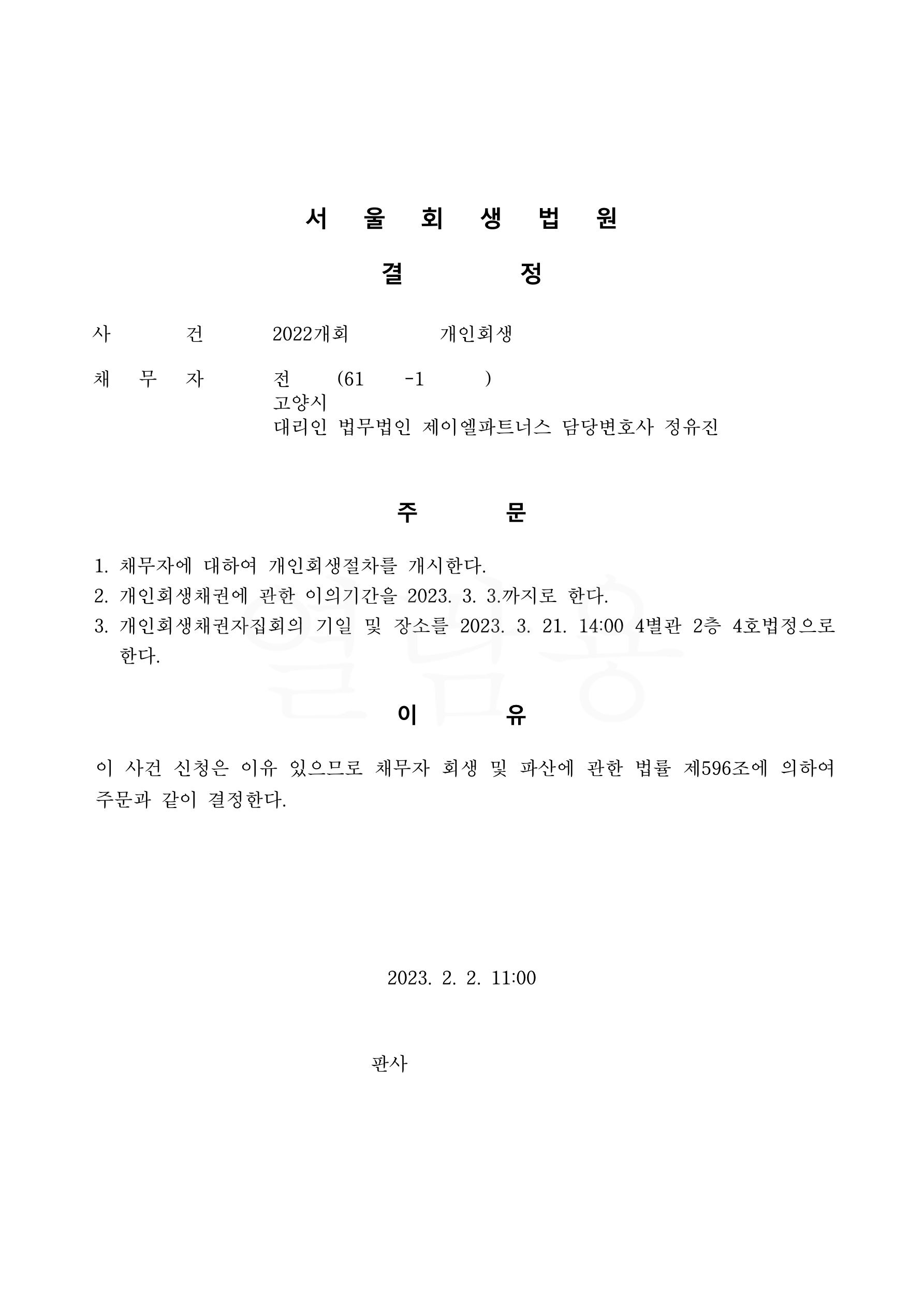 [서울회생법원]개인회생절차개시결정