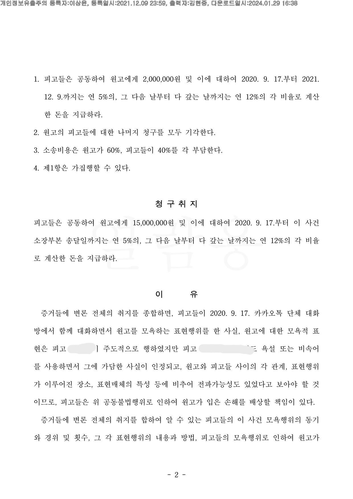이미 피고들이 모욕죄 형사처벌을 받은 상황 이었기에, 애초에 1,500만원을 전부 기각시킬 수는 없는 상황 이었고,