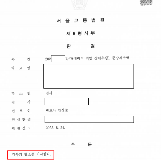 이런 노력들을 했는데 결과는 어떻게 되었을까요. 저의 의견을 받아들여 1심은 무죄로 판결 선고를 받았습니다. 하지만 무죄 판결에 검사는 즉각 항소를 하였고 다시 2심이 진행되었습니다. 하지만 이것도 자료를 충실히 제출한 바 검사 항소 기각이라는 무죄판결을 얻었지요.