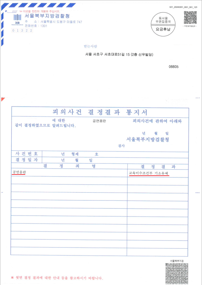 이에 서울북부지방검찰청은 의뢰인님에게 "기소유예처분"을 내렸습니다.