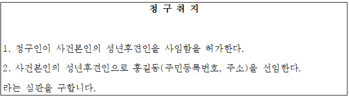 후견개시 심판문을 받고 2주가 지나 확정이 된 후부터는 청구를 취하할 수 없고, 피후견인이 사망하거나, 피후견인의 후견개시의 원인이 소멸되었을 경우에는 후견종료 심판청구(민법 제11조, 제14조)를 할 수 있으며, 이를 통해 후견이 종료되면 후견인의 지위에서도 사임이 되는 것이고, 민법 제939조에 따라 후견인은 정당한 사유가 있을 때 가정법원의 허가를 받아 사임할 수 있는데, 이때 제출하는 ‘(성년)후견인 사임에 대한 허가청구서’는 아래 예시처럼 후견에 공백이 발생하지 않도록 새로운 후견인의 선임을 함께 청구하여야 합니다.