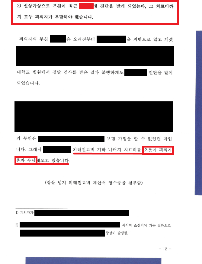 3) 2021년 경에는 A의 모친이 무릎과, 어깨에 연이어서 큰 수술을 받아야 했는바, 다른 가족들이 돈이 없어서 A가 혼자서 모두 부담하였음