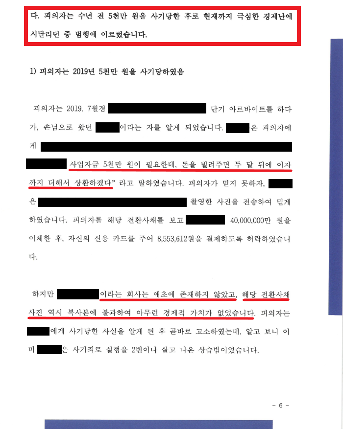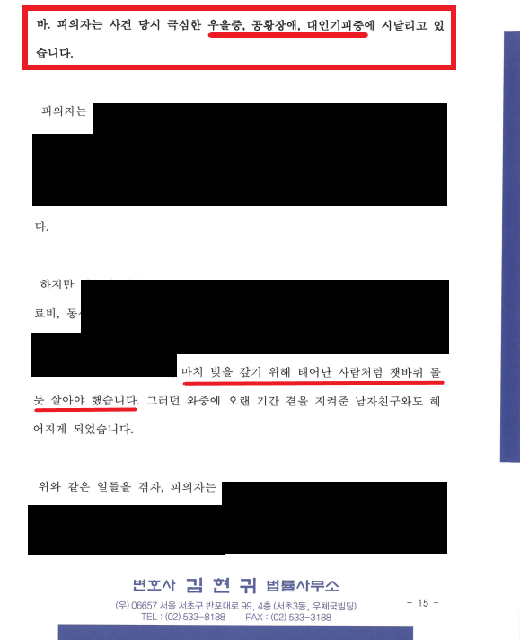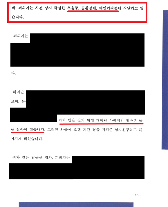 5) A는 사기 - 부모님의 건강 악화로 힘든 시간을 겪던 중, 수년 간 만나던 남자친구와도 헤어지게 되면서 극심한 우울증, 대인기피증, 공황 장애에 시달리게 됨