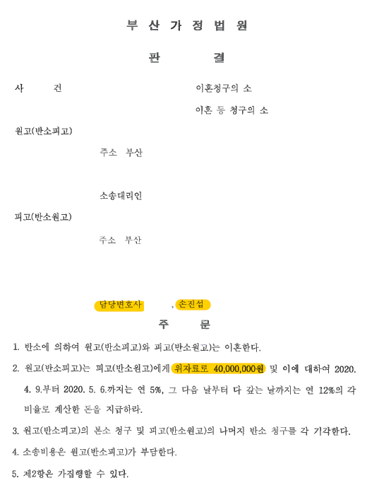 이에 재판부는 본 대리인의 주장을 대부분 받아들이며 남편인 원고의 이혼 청구를 기각하고, 의뢰인의 반소 청구를 받아들였고 남편이 의뢰인에게 4,000만 원의 위자료를 지급할 것을 내용으로 하는 판결을 선고하였습니다. 일반적인 이혼 사건의 경우, 그 위자료가 최대 3,000만 원 내외이나 본 사건의 경우, 4,000만 원이라는 위자료가 인정되었습니다. 이에 남편의 불륜과 소송으로 큰 충격을 받은 의뢰인께서도 재판의 결과로 조금이나마 위로를 받을 수 있게 되었습니다.