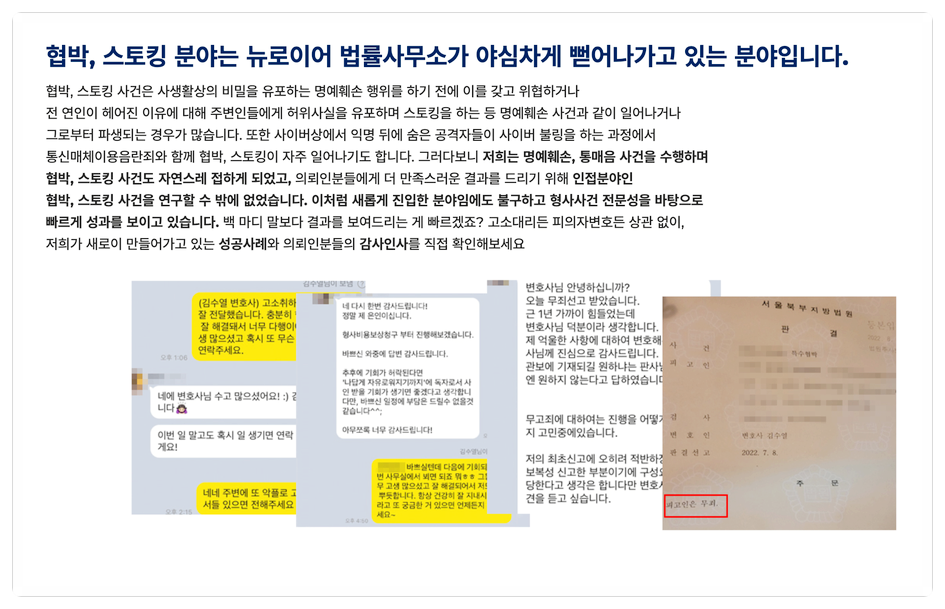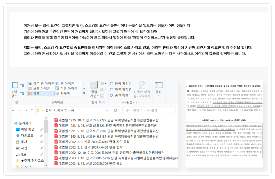 이는 저희가 스토킹, 협박, 불안감 조성과 같은 혐의들에서 이러한 방법으로 무혐의를 이끈 경험이 있기에 솔직하게 말씀드릴 수 있는 부분인 것 같습니다.