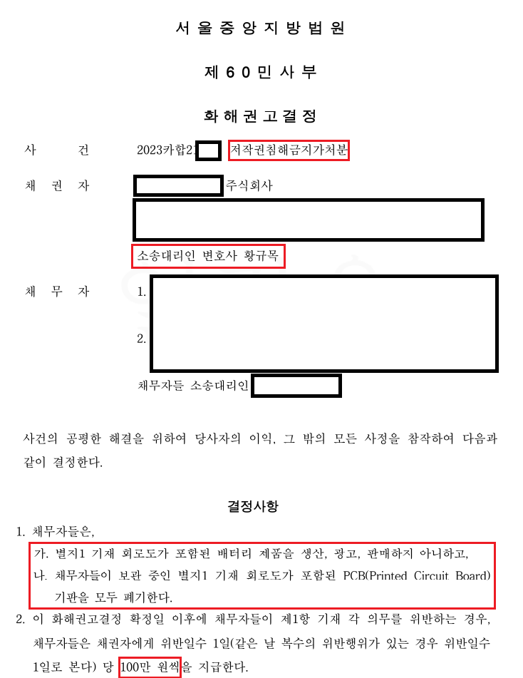 의뢰인은 상대방이 자신의 배터리 제품에 관한 'PCB 회로도' 를 그대로 복제한 뒤 이를 포함한 배터리 제품을 판매하는 것을 발견하고, 이에 대해 침해금지 가처분 조치를 취하고자 저에게 사건을 의뢰하였습니다.