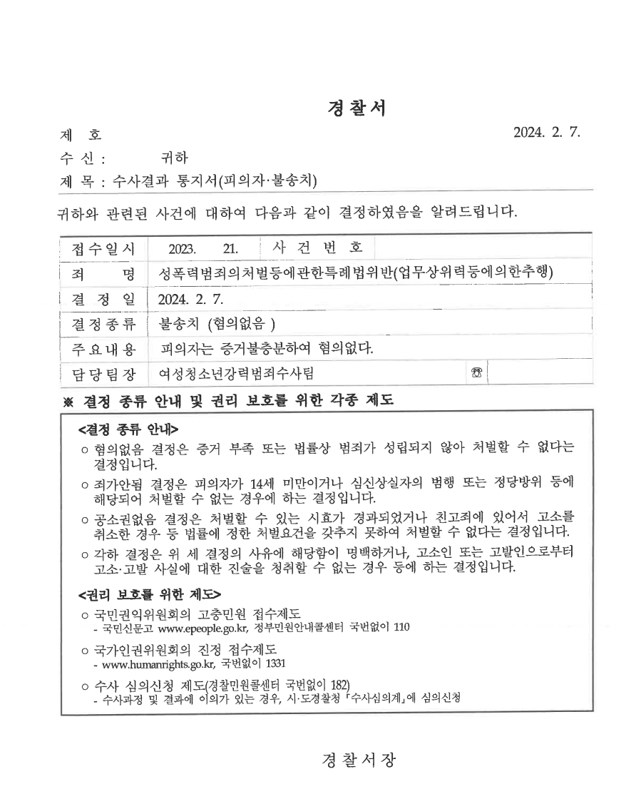 5. 이러한 조력을 받은 A씨는 업무상 위력 추행 사건에서 결과적으로 불송치(혐의없음)을 받음으로써 성범죄자 전과가 남지 않고 평온한 일상으로 돌아갈 수 있었습니다.