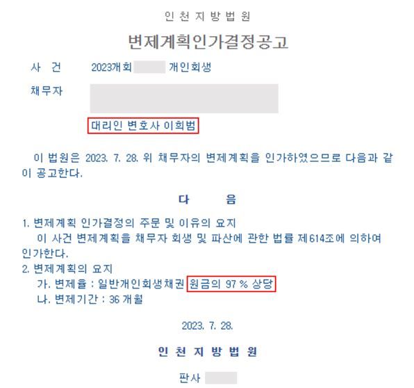 [ 개인회생 성공사례 ] 변제율 : 원금의 97%