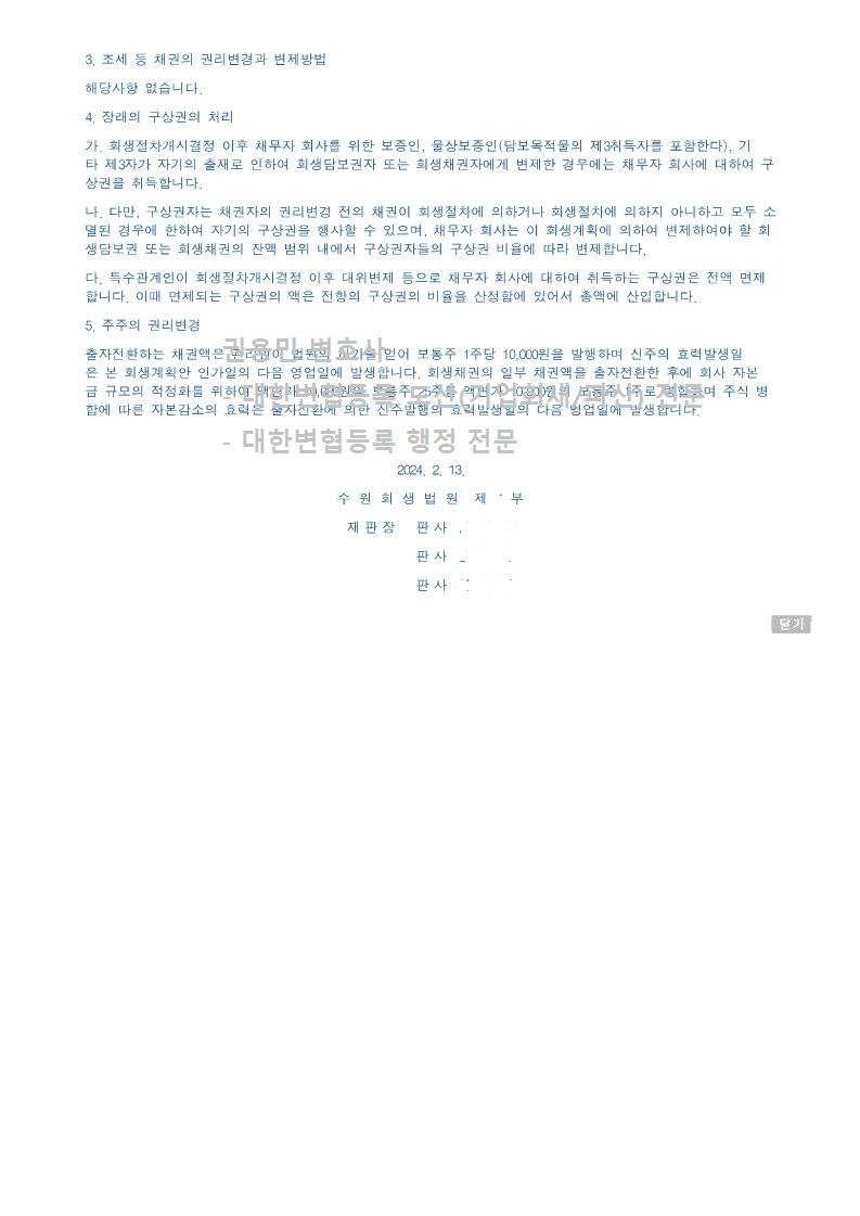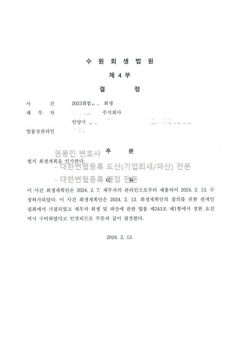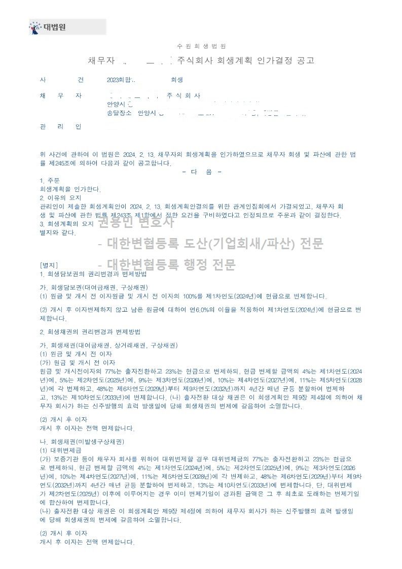 2024. 02. 14. 법인회생인가(수원회생법원) 사례