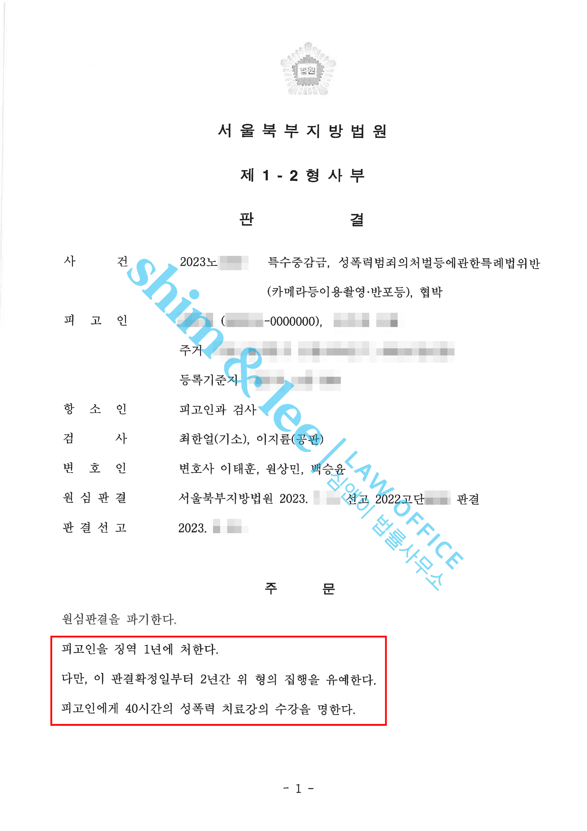 - 1심 1년 징역(법정구속), 성폭력 치료강의 40시간