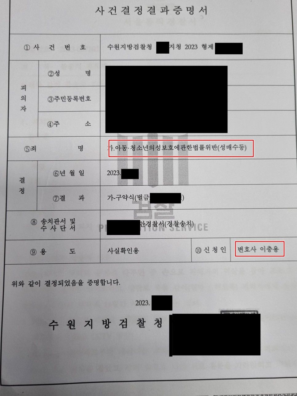 아청법 성매수 사건의 경우 벌금형 처분이 나온다 하더라도 일단 구공판 청구되어 재판에서 벌금형 처분을 받는 경우가 많은데, 이 사건의 경우 검사님의 선처로 재판까지 가지 아니하고 원하던 벌금형 처분을 받을 수 있었습니다.