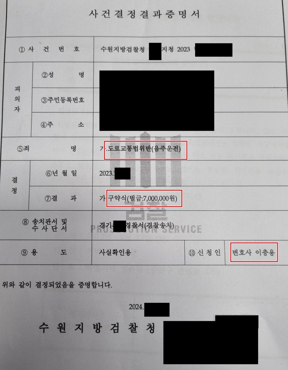 음주운전 2진으로 집행유예 또는 실형을 선고받을 가능성도 있었지만 다행히 수사 단계에서부터 적극적으로 대응하여 재판 없이 구약식 벌금형 처분으로 마무리된 사건이었습니다.