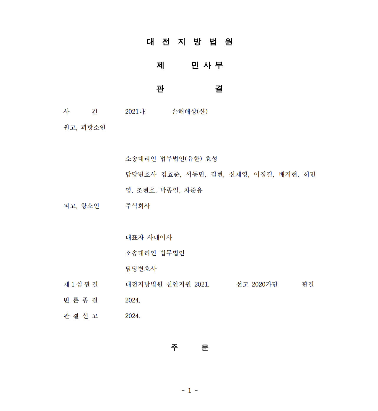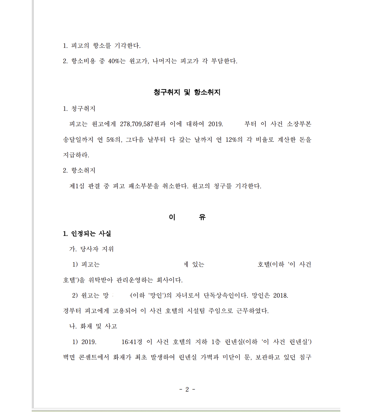 저는 즉각 손해배상청구소송을 제기하여 망인이 피고 호텔에서 근무하다 화재로 사망한 점을 주장 입증하였고 피고는 대표이사가 업무상과실치상에 대해 무죄 판결을 받았으며 또한 손해배상 감경을 주장하였습니다. 원고는 1심에서 승소하였고 항소심 역시 원고 전부 승소 판결을 선고하였습니다.