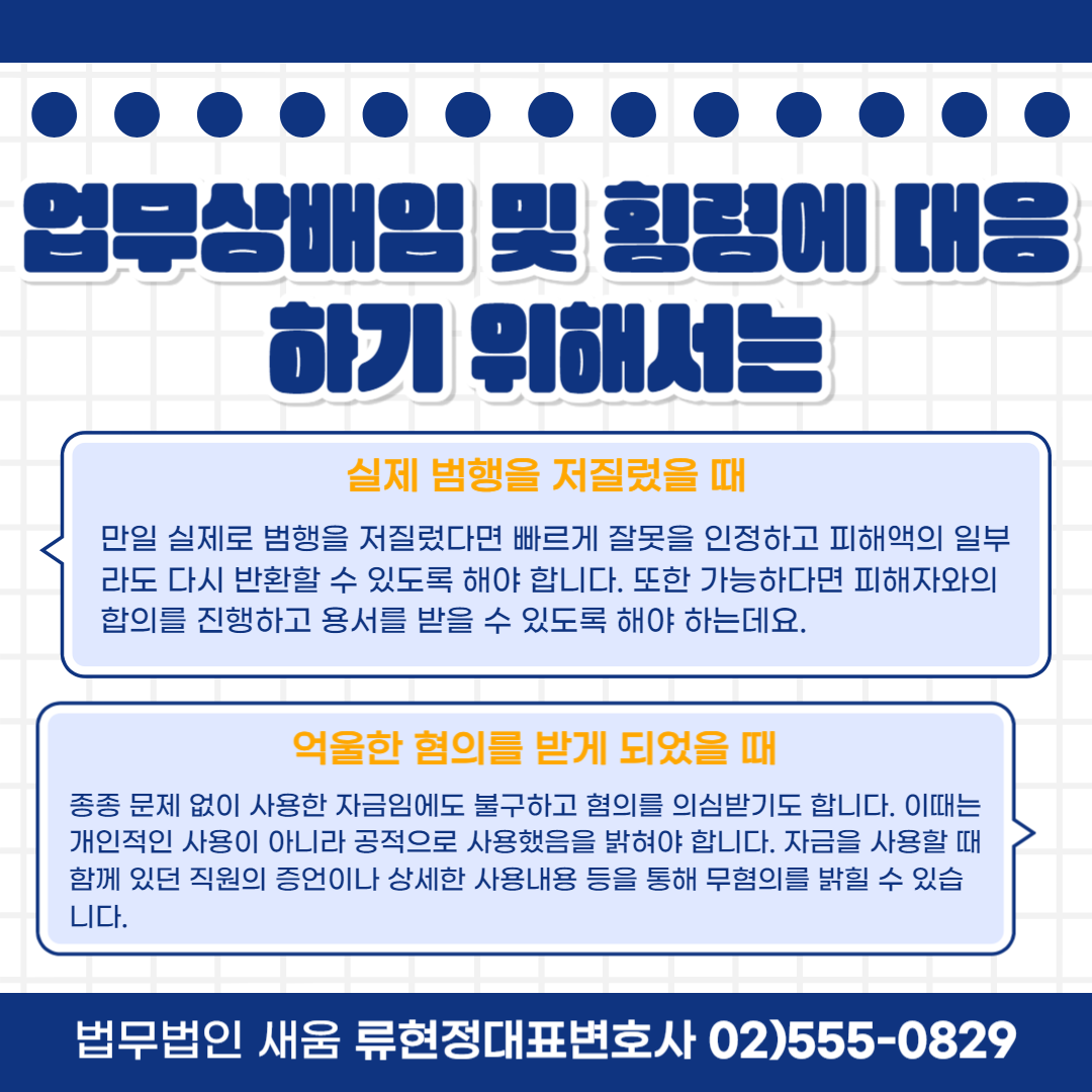 종종 문제 없이 사용한 자금임에도 불구하고 혐의를 의심받기도 합니다. 이때는 개인적인 사용이 아니라 공적으로 사용했음을 밝혀야 합니다. 자금을 사용할 때 함께 있던 직원의 증언이나 상세한 사용내용 등을 통해 무혐의를 밝힐 수 있습니다. 또한 종종 자금을 잘못 전송하는 등의 일이 발생해 오해를 받기도 하는데, 이럴 때는 자금 전송 오류 후 다시 반환을 했다는 것과 실수로 일어난 일이었다는 점을 입증하여 혐의를 부인해야 합니다. 만일 혐의를 부인해야 할 때는 회사와 합의를 할 필요가 없으며 빠르게 증거부터 수집하여 누명을 벗을 수 있도록 해야 합니다.