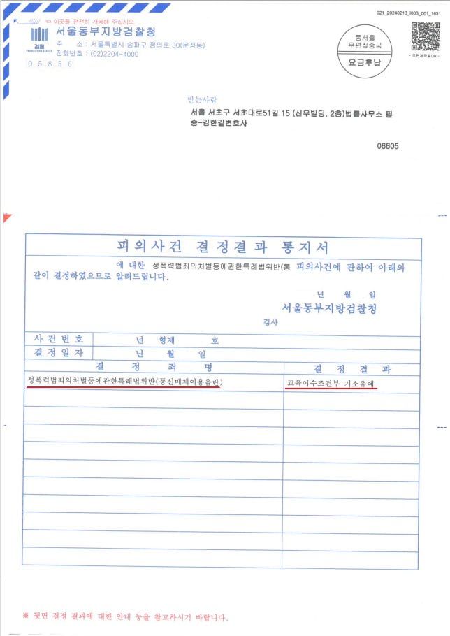 ※ 이에 의뢰인님은 김준환 변호사를 선임하여 "기소유예처분"을 받았습니다.