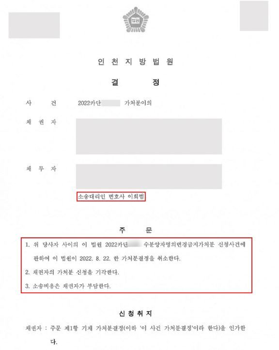 법원은 심리에서 양 당사자의 주장을 듣고 오랜기간 고민한 끝에 채권자의 주장은 받아드릴 수 없고, 채권자의 가처분 신청은 피보전 권리 및 그 보전의 필요성을 인정할 수 없어 이 사건 가처분 결정을 취소하고 가처분 신청을 기각하기로 한다고 하였습니다. 법원은 채권자와 채무자 사이의 수분양자 명의변경 금지 가처분 신청사건에 관하여 한 가처분 결정을 취소하기로 하며 가처분 이의신청을 받아들여 저희 의뢰인의 편을 들어 주었습니다. 양측 다 변호인을 선임하여 치열하게 다투었음에도 다행히 의뢰인에게 좋은 결과로 마무리 지을 수 있었습니다.